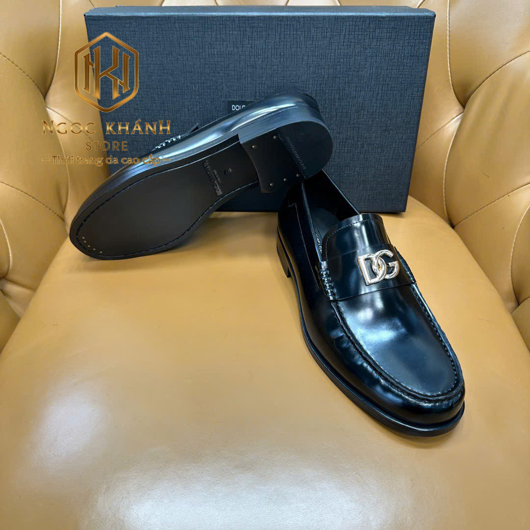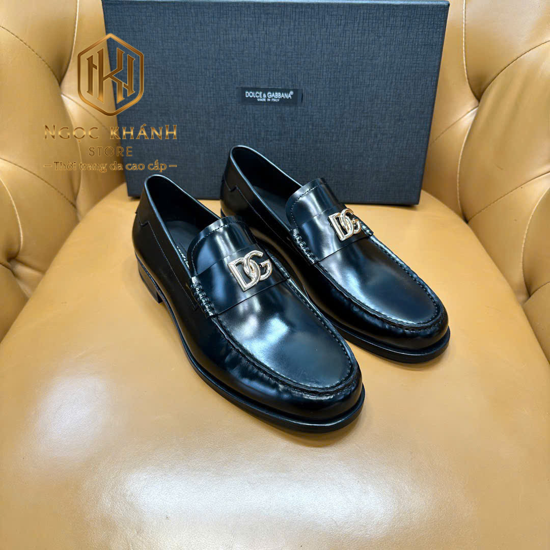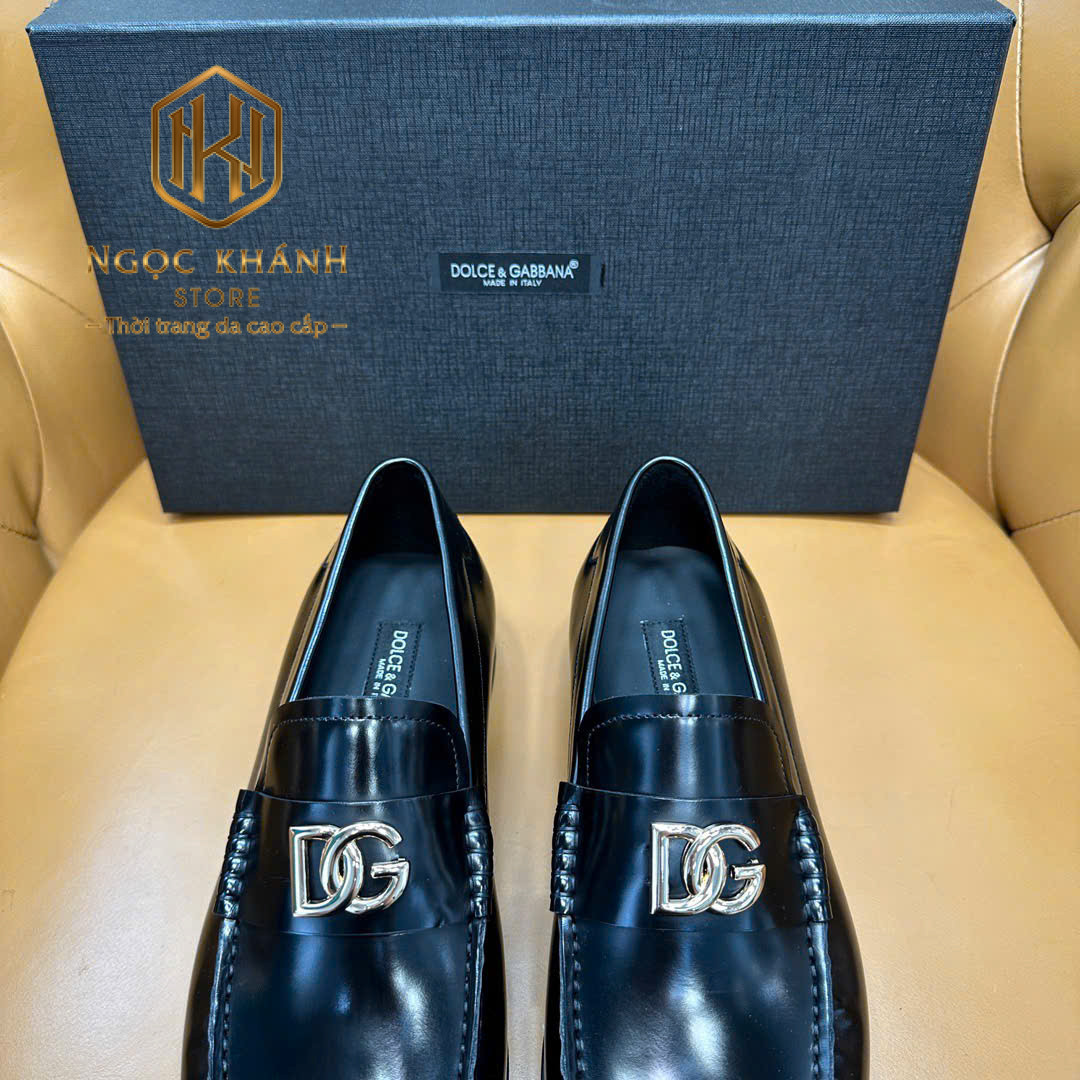 GIÀY LƯỜI DOLCE GABBANA NAM MÀU ĐEN ĐẾ CAO DA BÓNG HỌA TIẾT LOGO TRẮNG GLDG07