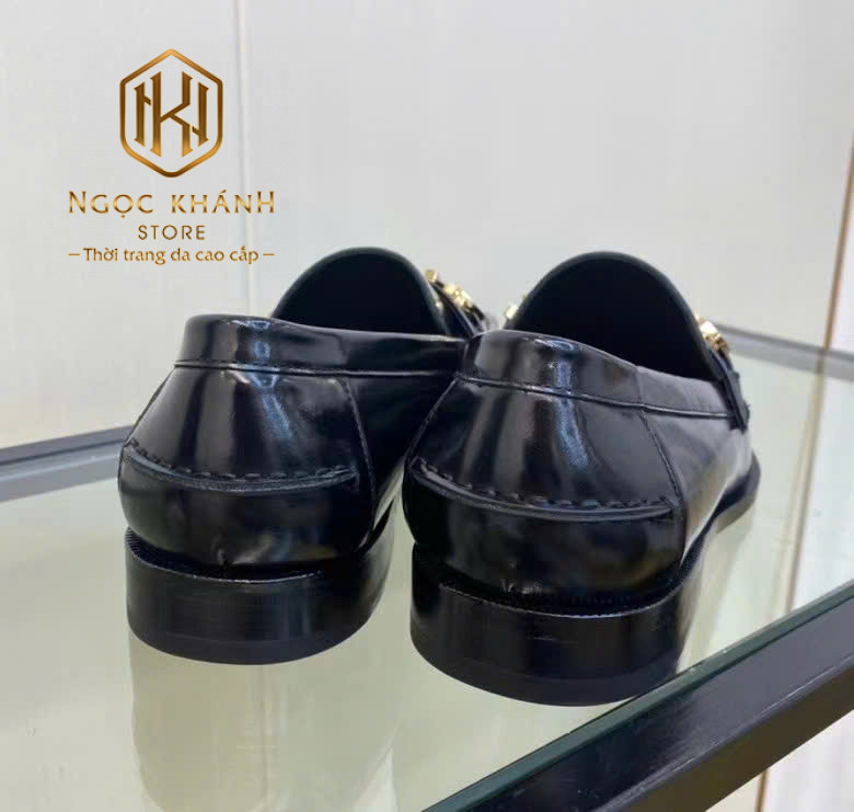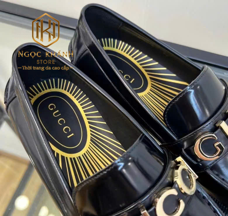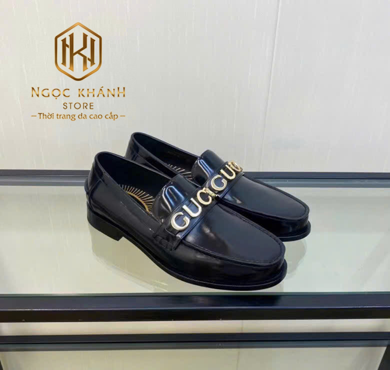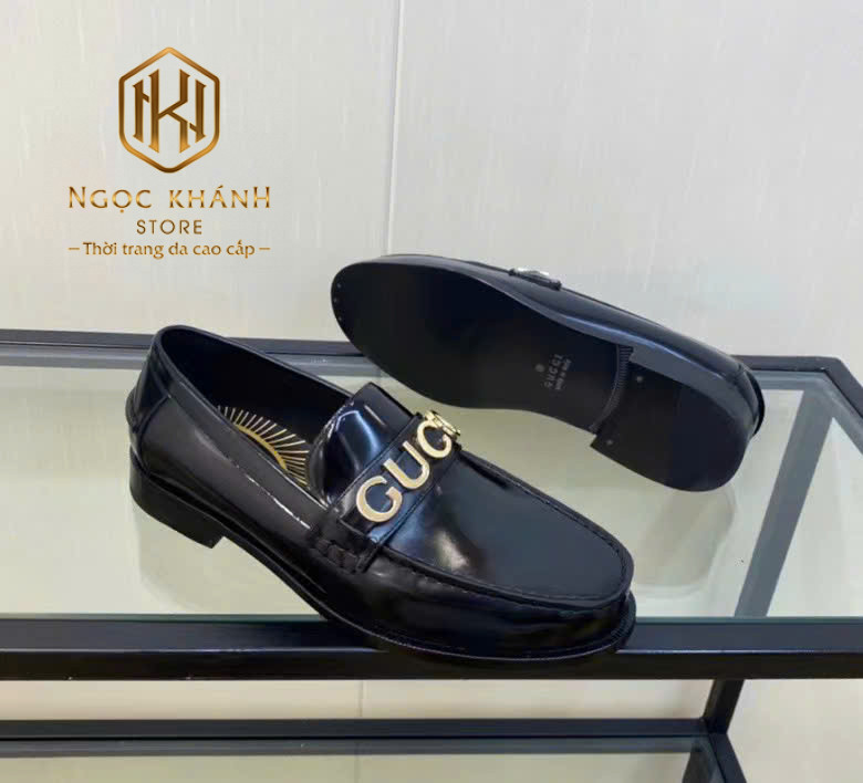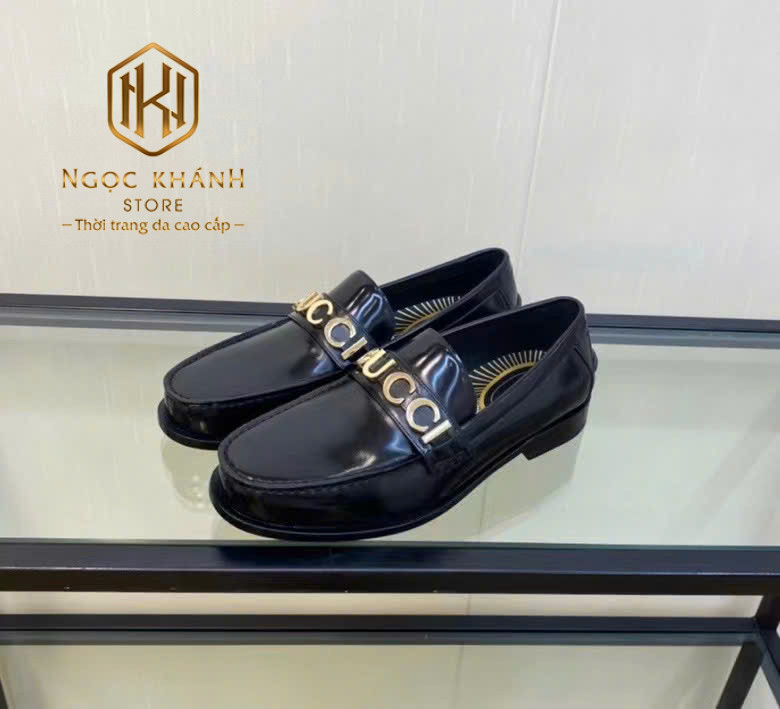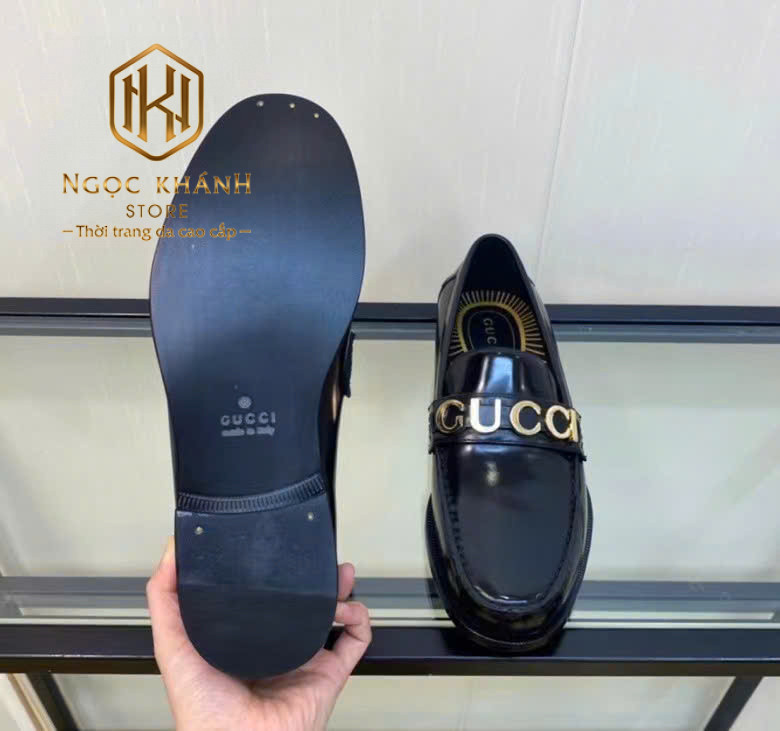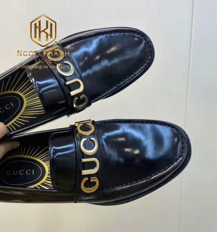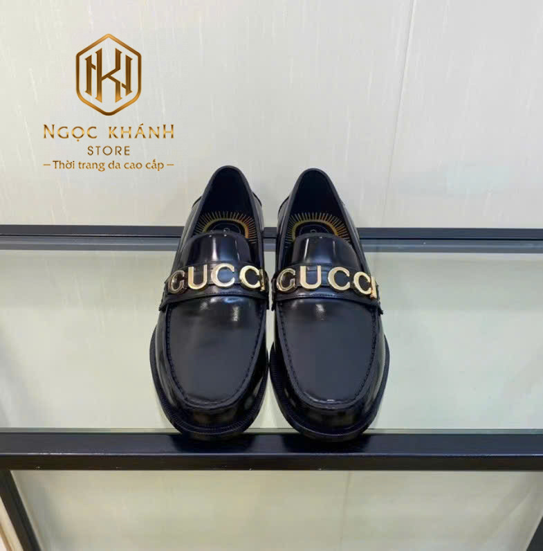 GIÀY LƯỜI GUCCI NAM ĐẾ CAO MÀU ĐEN HỌA TIẾT LOGO CHỮ VÀNG LIKEAUTH GLGC35