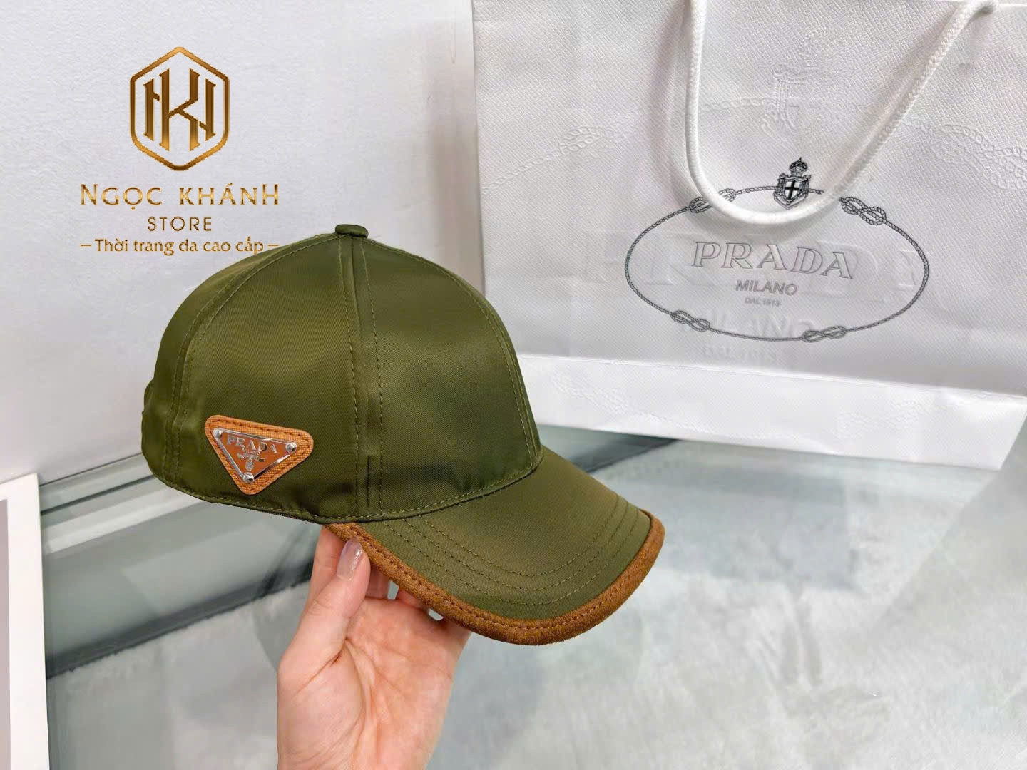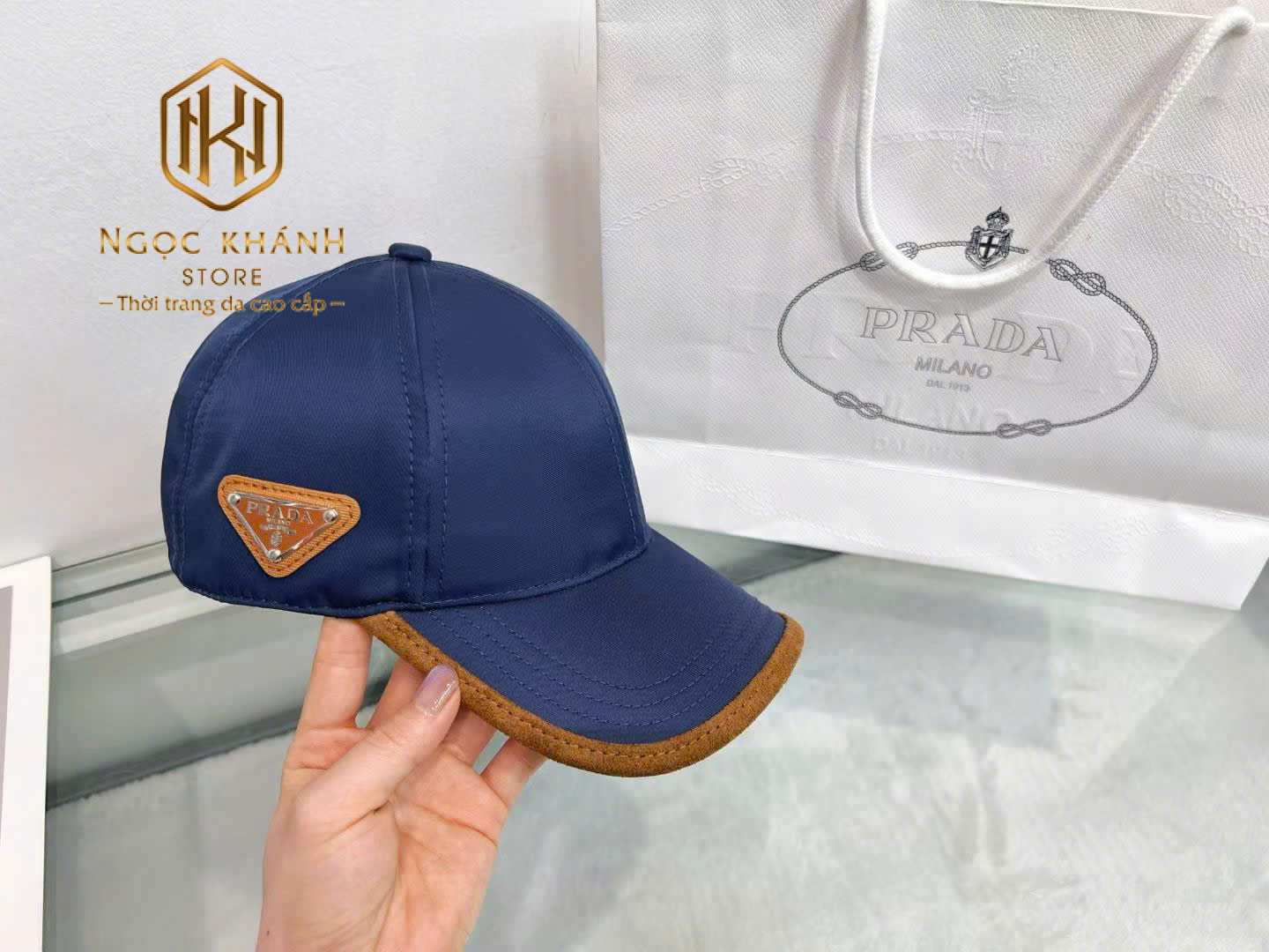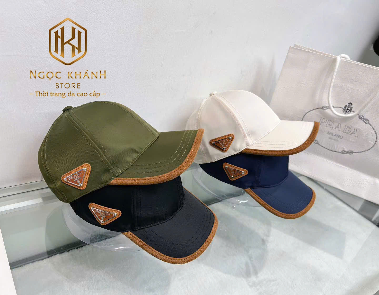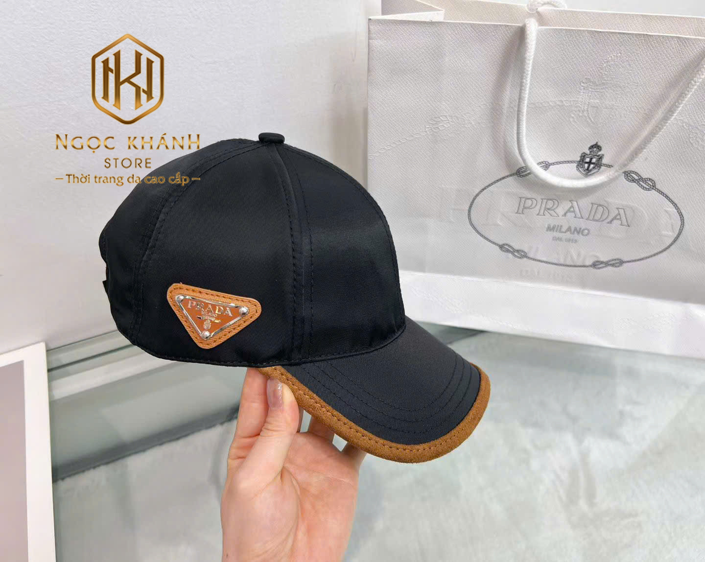 MŨ NAM PRADA TRƠN HỌA TIẾT LOGO TAM GIÁC VIỀN NÂU MNPR04