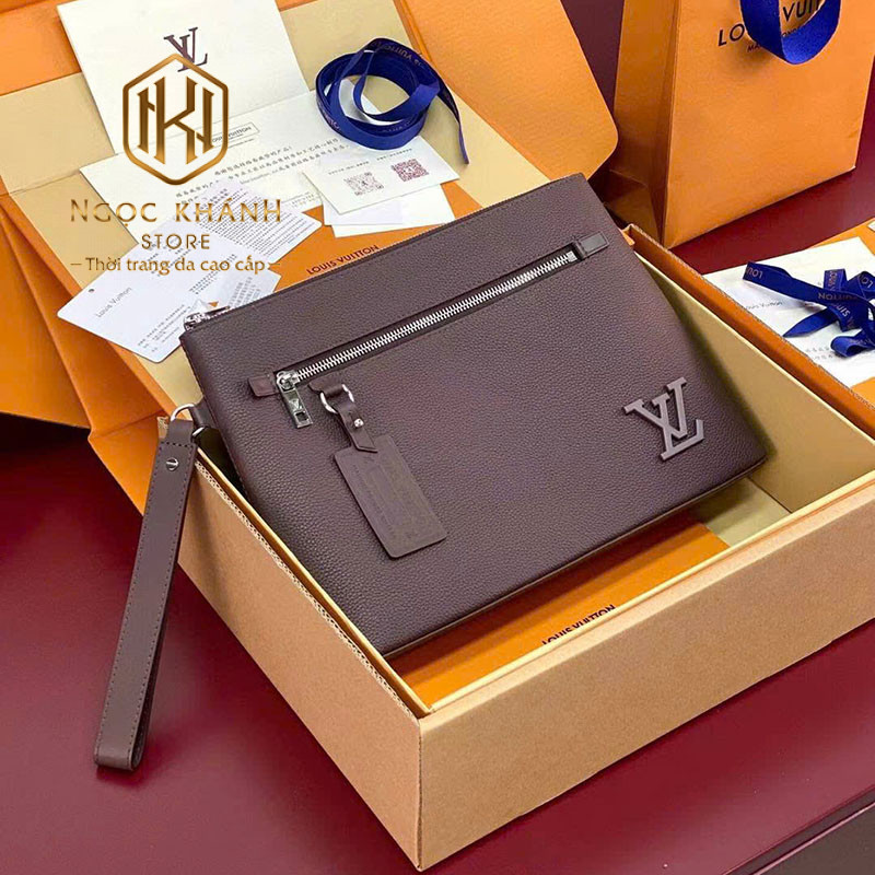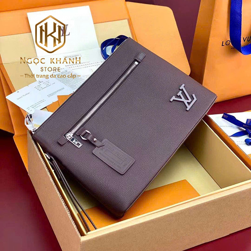 VÍ NAM LOUIS VUITTON CẦM TAY MÀU NÂU DA NHĂN HỌA TIẾT LOGO NỔI GÓC VNLV99