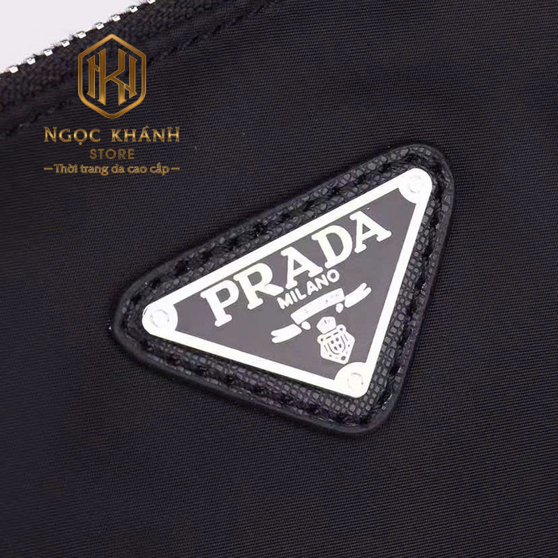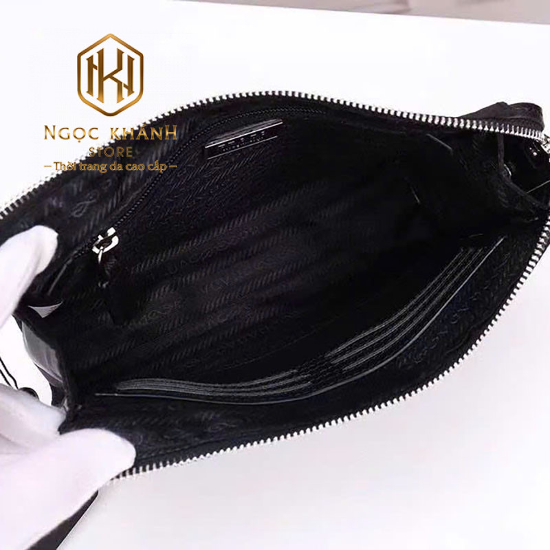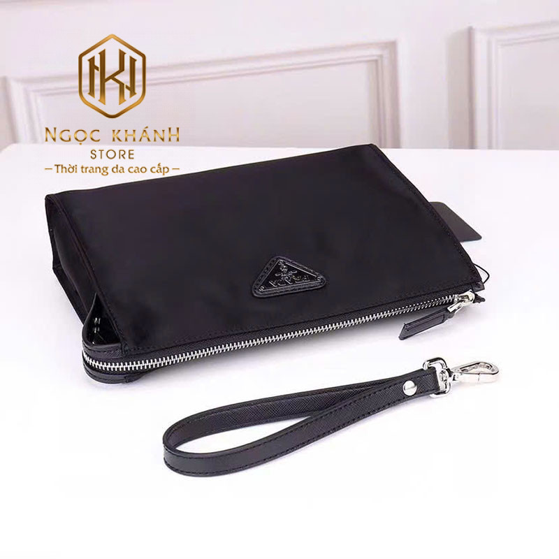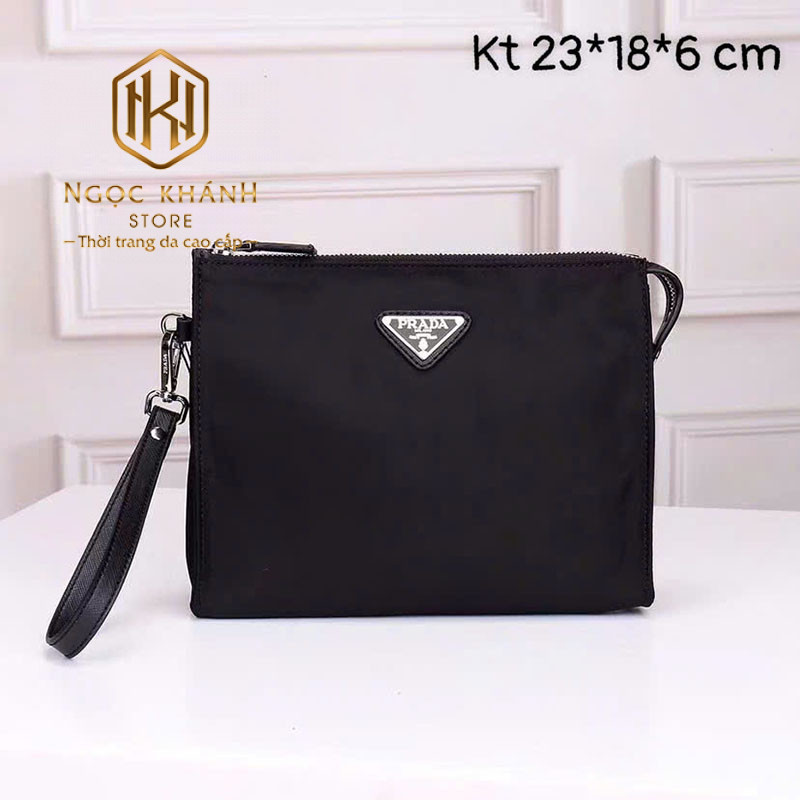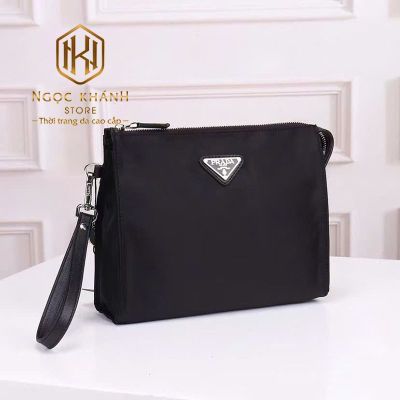 VÍ NAM PRADA CẦM TAY VẢI ĐEN HỌA TIẾT LOGO TAM GIÁC VNP21