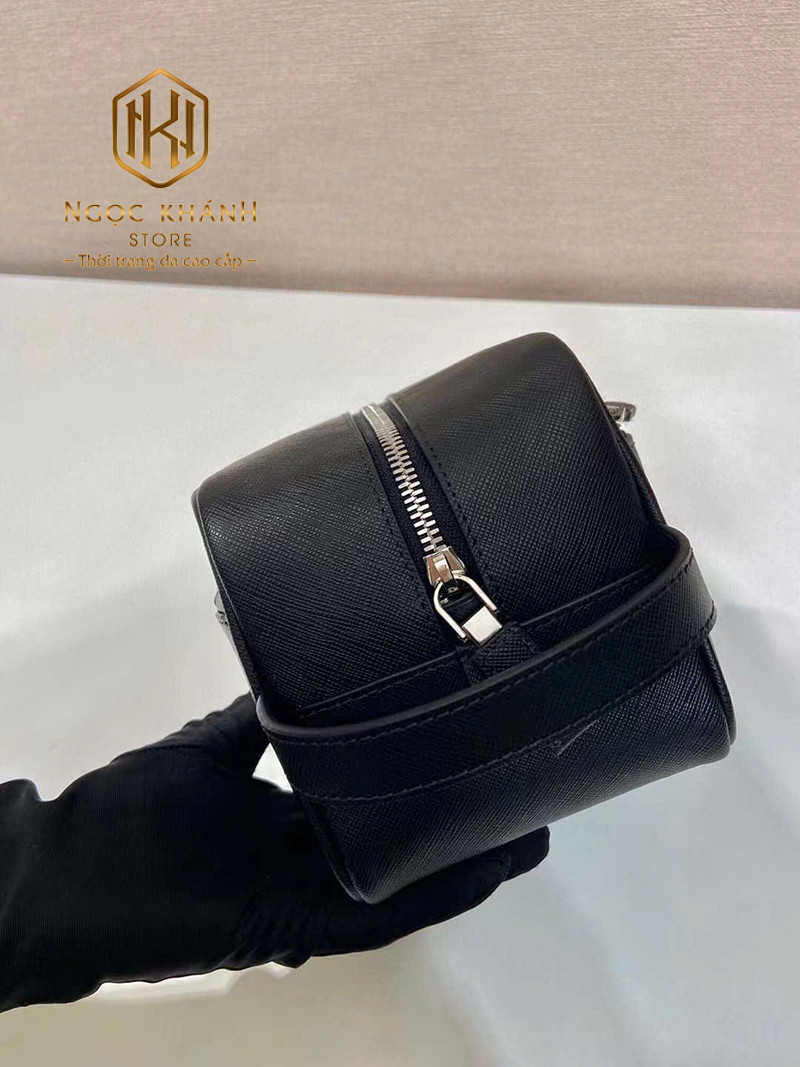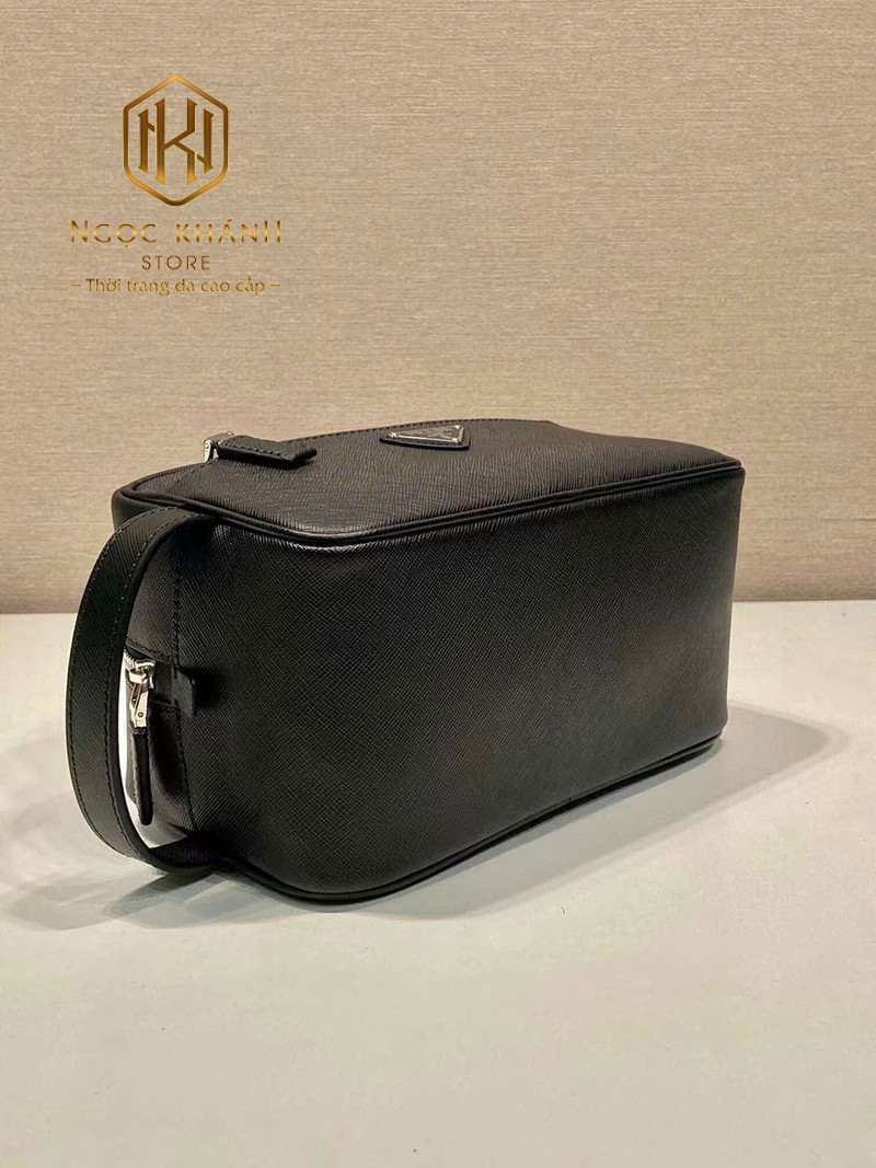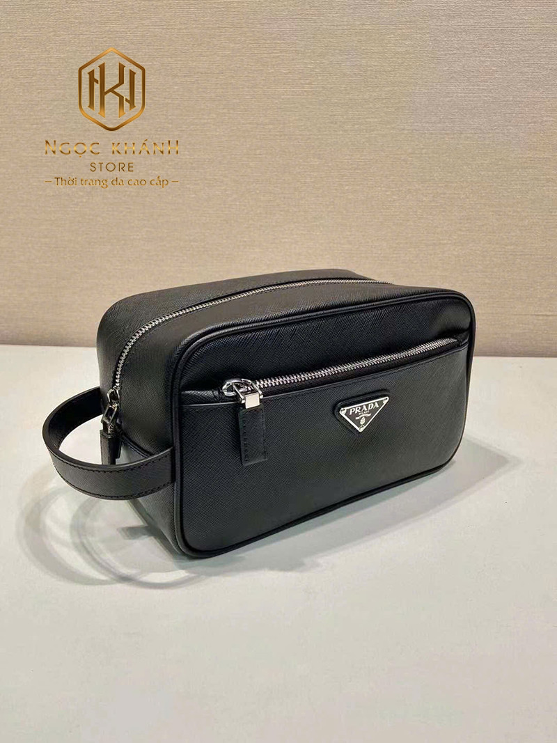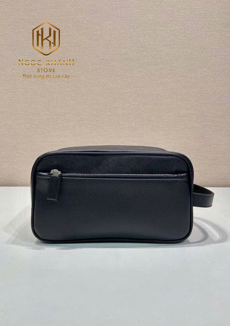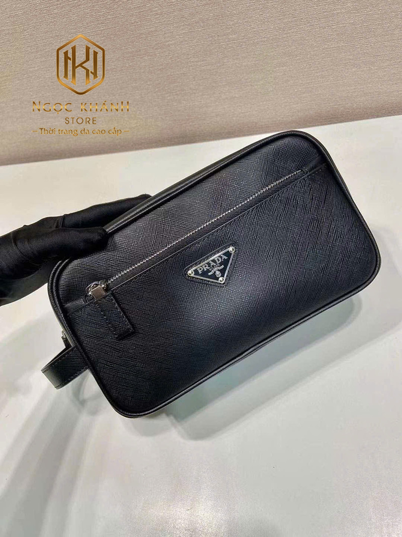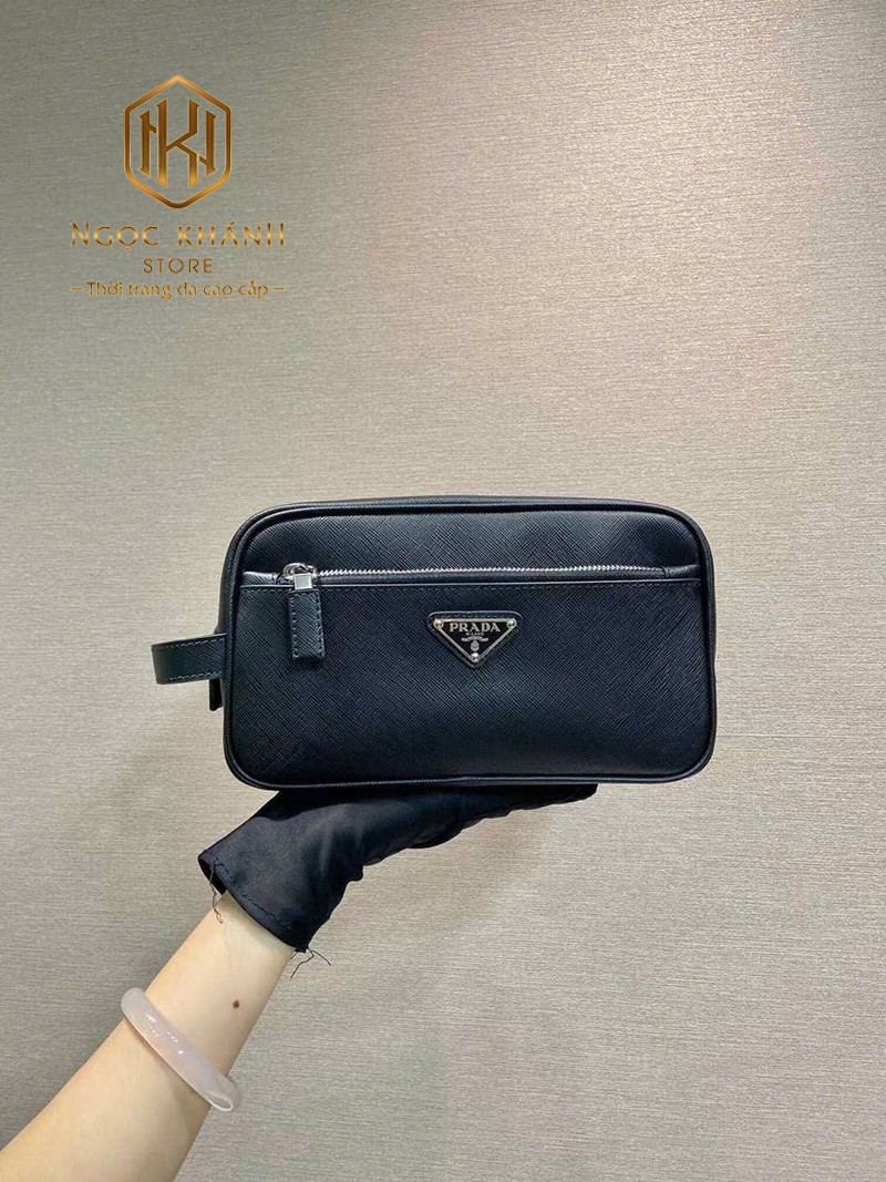 VÍ PRADA NAM CẦM TAY MÀU ĐEN HỌA TIẾT TAM GIÁC KHÓA KÉO VNP19